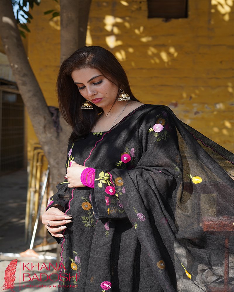 Crafted on delicate cotton net fabric, the dress features refined Multani embroidery detailed with traditional Multani tanke. The bright color combinations against the deep black base create a statement that is both minimal and unforgettable.